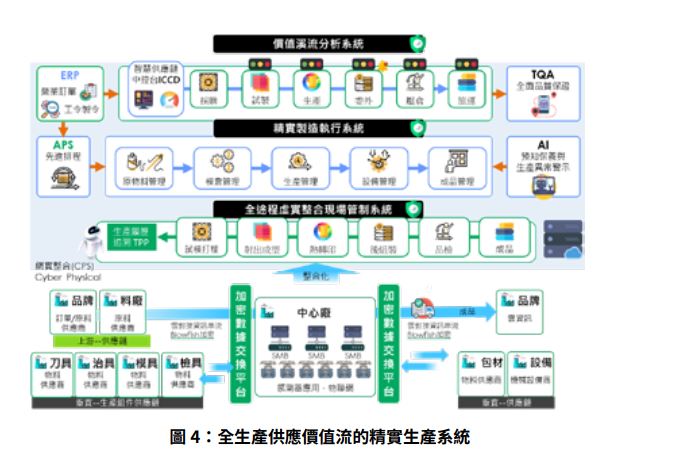以下將例舉精實生產系統,將上述理念具體化設計於生產數位化變革中。其首以製造規範系統來定義全生產供應價值流:包含串整 ERP 之產品線及產品資訊,並據以界定共通或特定之製造全途程,可能包含上游原物料供應商、中心廠、平行代工廠、下游加工廠直到品牌商、貿易商等製造、運送、倉儲及品檢之過程。