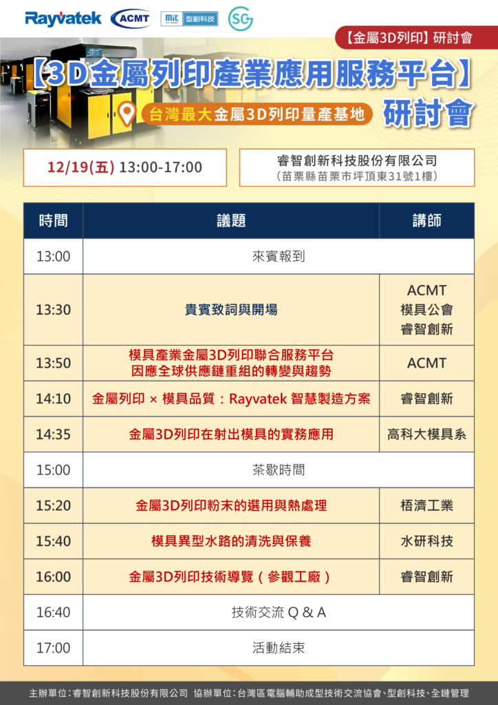 | 16:00 | 金屬3D列印技術導覽(參觀工廠) | 睿智創新 |
