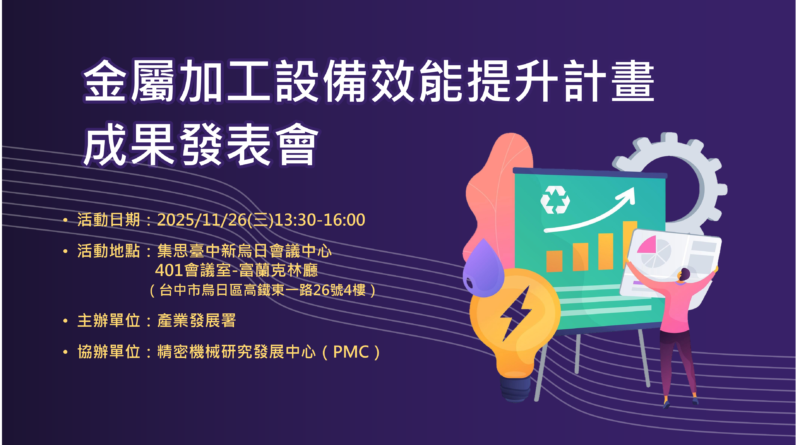 經濟部產業發展署敬邀產業先進們蒞臨11月26日「金屬加工設備效能提升計畫-成果發表會」,共同見證導入節能低碳技術與成果,協助您發想未來低碳節能發展藍圖,加速邁向綠色轉型。