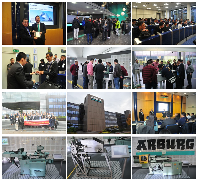 參觀Arburg位於K2016的攤位參訪,Arburg是全球領先的射出成型機設備製造廠及射出技術開發企業,生產的射出成型機鎖模力由125kN到5000kN(千牛頓),不同效能的機種繁多,包括液態矽橡膠射出、複合材質、金屬粉末射出、Mucell微細發泡等等。應用範圍-生產汽車塑料零組件、消費電子、醫療技術及家用電器等。