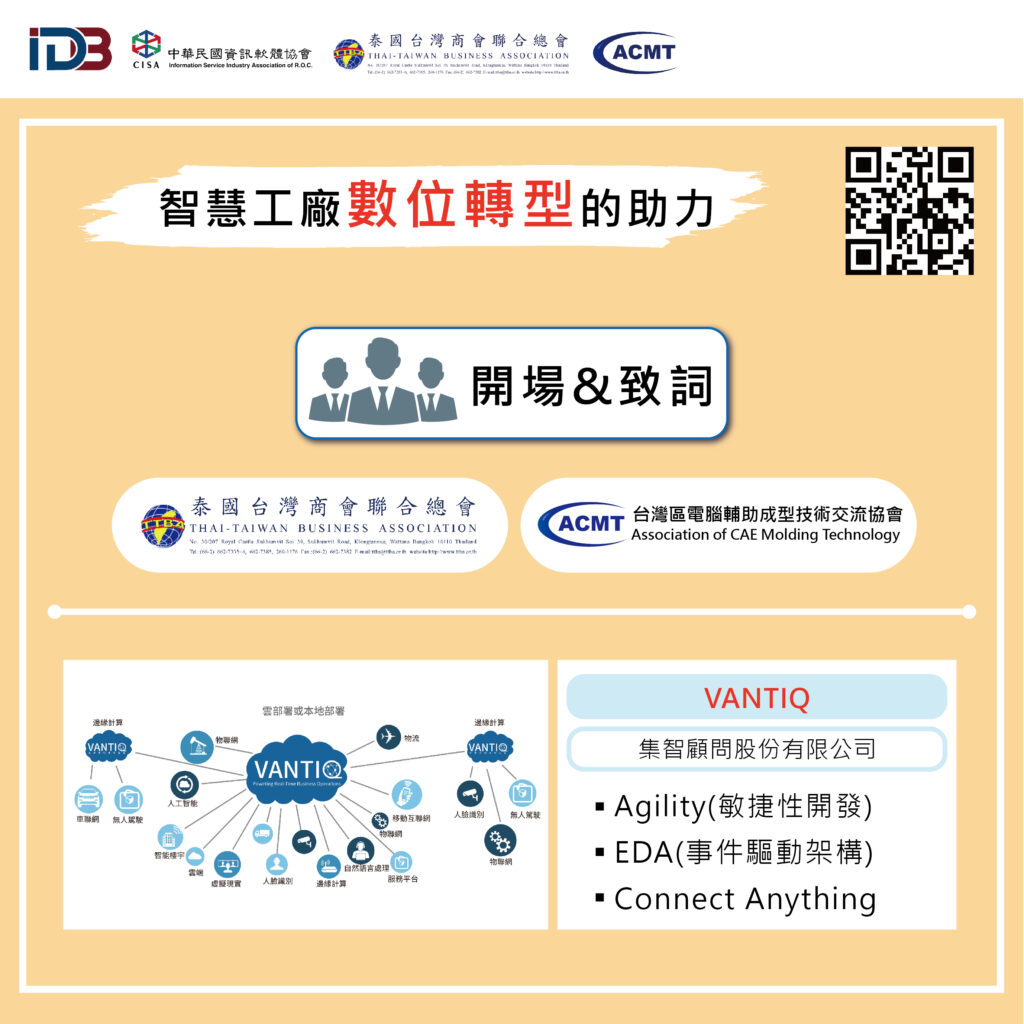| 14:10 (TW) 13:10 (TH) | VANTIQ 雲端技術、資通訊(ICT)系統及整合顧問服務 數據分析、數位雙生、事件驅動架構及人工智慧之導入 | WisdomGather 集智顧問股份有限公司 |