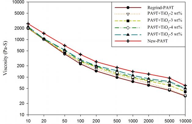二氧化钛的含量在回收料尼龙9T/奈米复材的射出成型品之黄变/反射率/机械/热/流变性质之研究 |