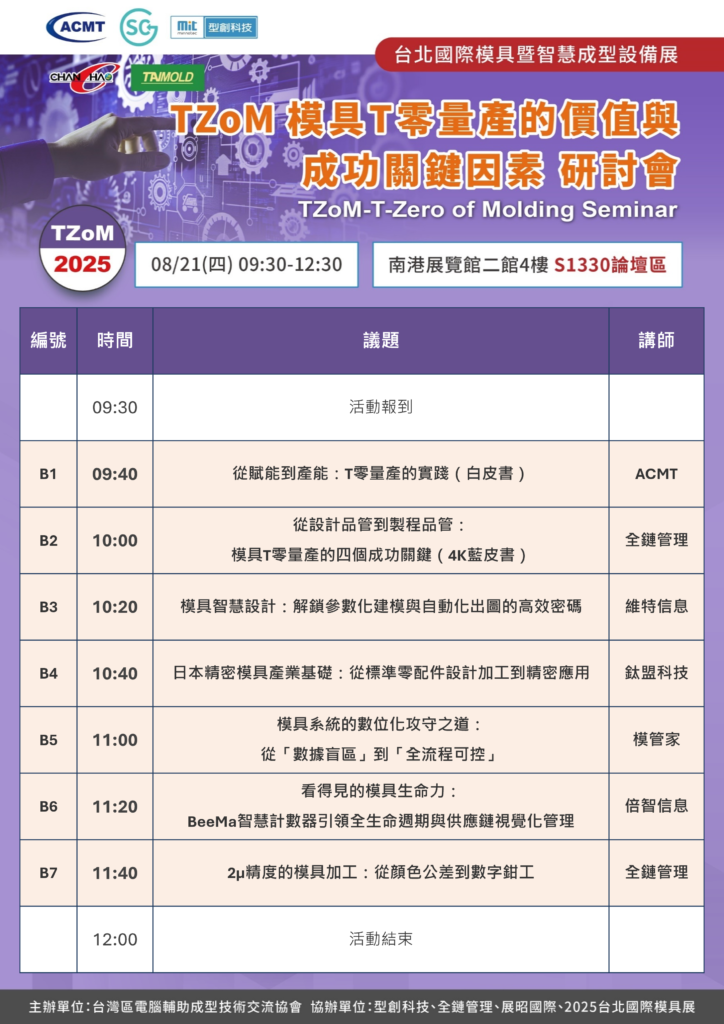 T零量產不只是技術整合,更是產業升級的戰略實踐,本場研討會將深入探索從設計端開始,如何透過數位工具、精準製程與科學管理,實現真正的T零量產,重塑模具開發價值鏈。從4K成功關鍵解析、模具智慧設計、自動化出圖到2μ精度加工挑戰,涵蓋設計、製造、品管三大系統,系統性整理推動T零量產的實戰架構。