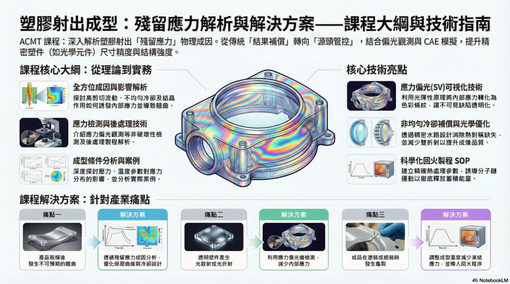 旨在協助學員深入理解塑膠射出成型中殘留應力的物理成因,掌握優化成型參數與後續回火處理的技巧,從而確保產品的尺寸精度與結構強度,特別是針對高精密光學元件的品質優化。